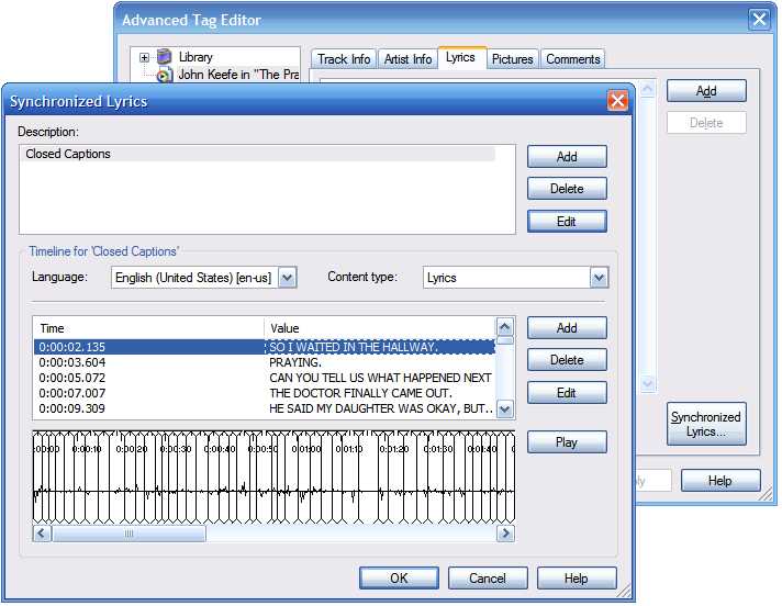 the synchronized lyrics editor that’s part of the Advanced Tag Editor in Media