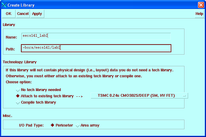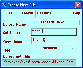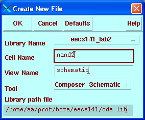 library called ee141_lab2 (select File/New/Library). This will open new dialog window,