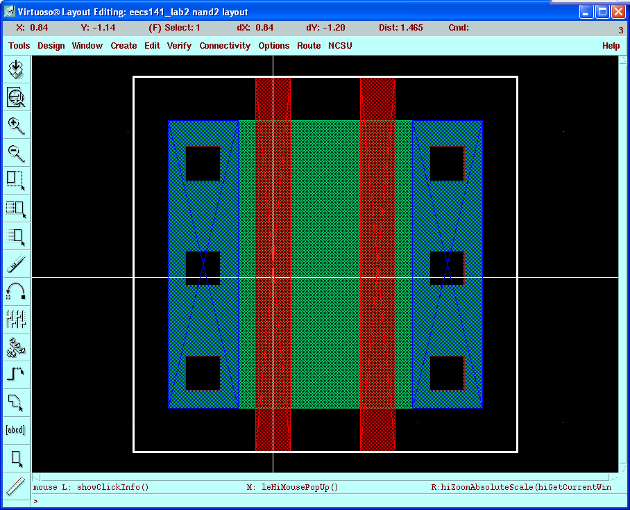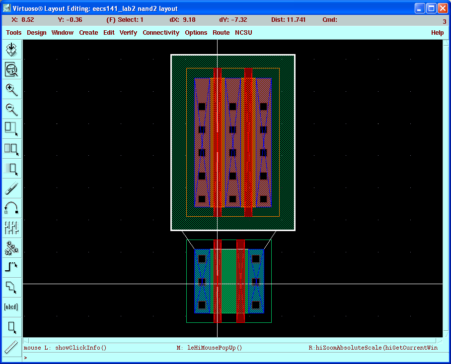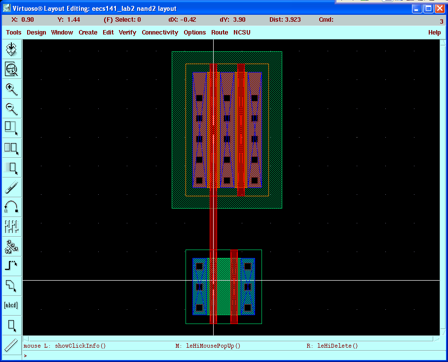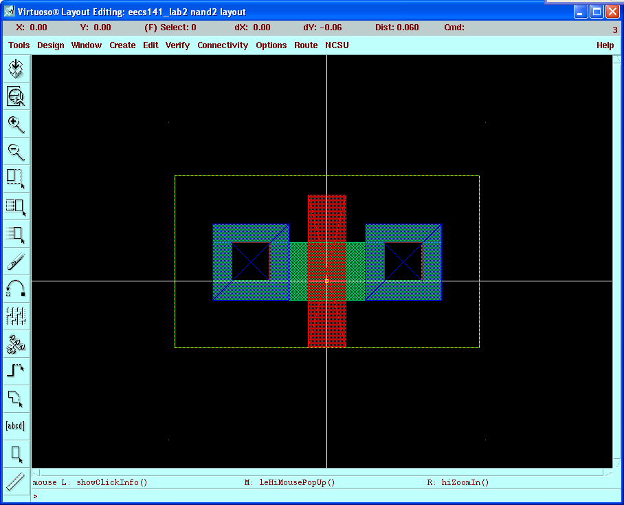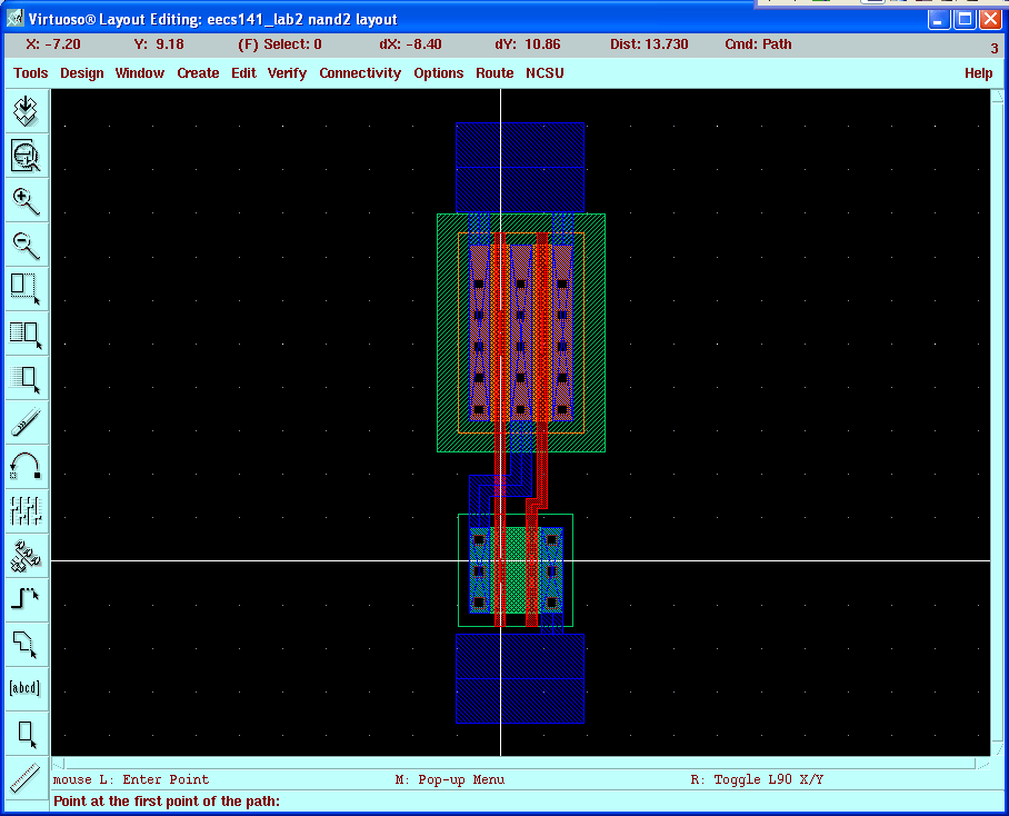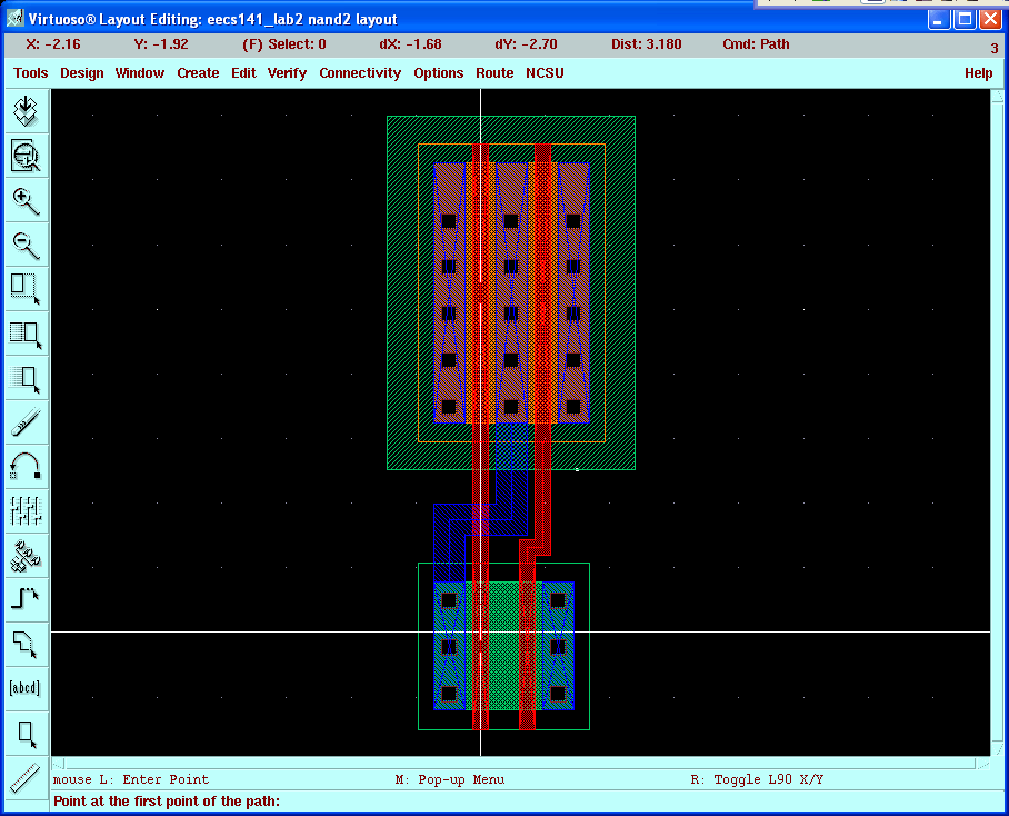 bar should say " Virtuoso Layout Editing: ee141_lab2 nand2 layout