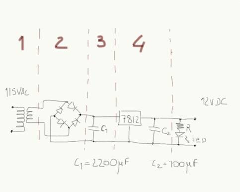 the Voltage Regulator is 7812, which gives an output voltage of 12V.