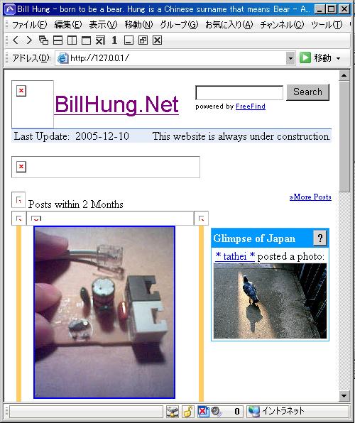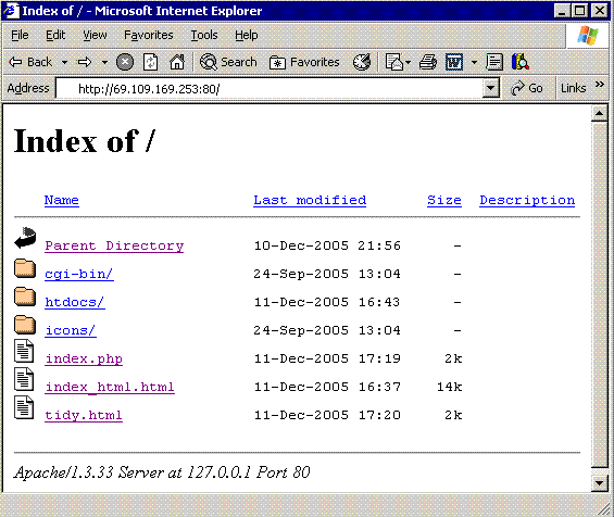 11 Dec 2005 I just got the HTTP server running with Apache on my computer. The picture is a page requested from the Berkeley computer. The IP points to my home router, and HTTP requests (port 80) will be forwarded to my computer instead of my roommates' computers. Anyway, we are using not dynamic IP of this moment, so the ip shown in the picture will change. Now I can do all the SSL, SQL, shell all on my computer. The server for BillHung.net does not allow me to perform cp commands, that sucks.