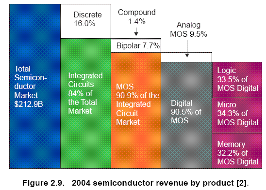 Notice the market share of digital MOS is 90%. For the break downs of the digital MOS. I think Logic is more CS150 or CS 152, Micro. is more 145m, and memory I think is more EE 141.